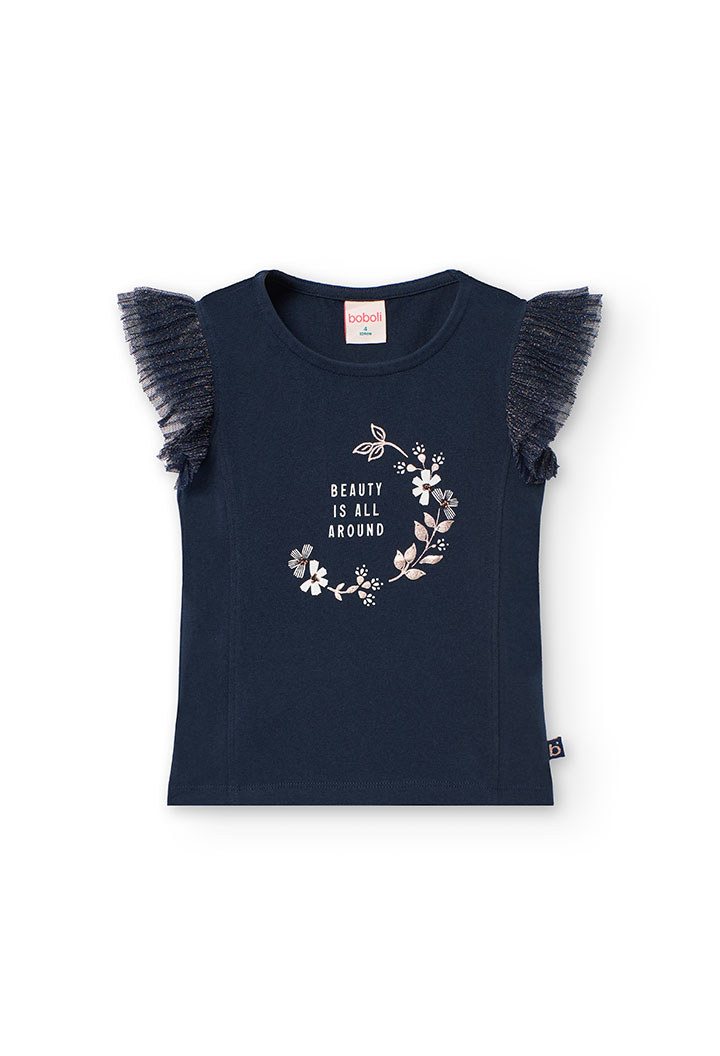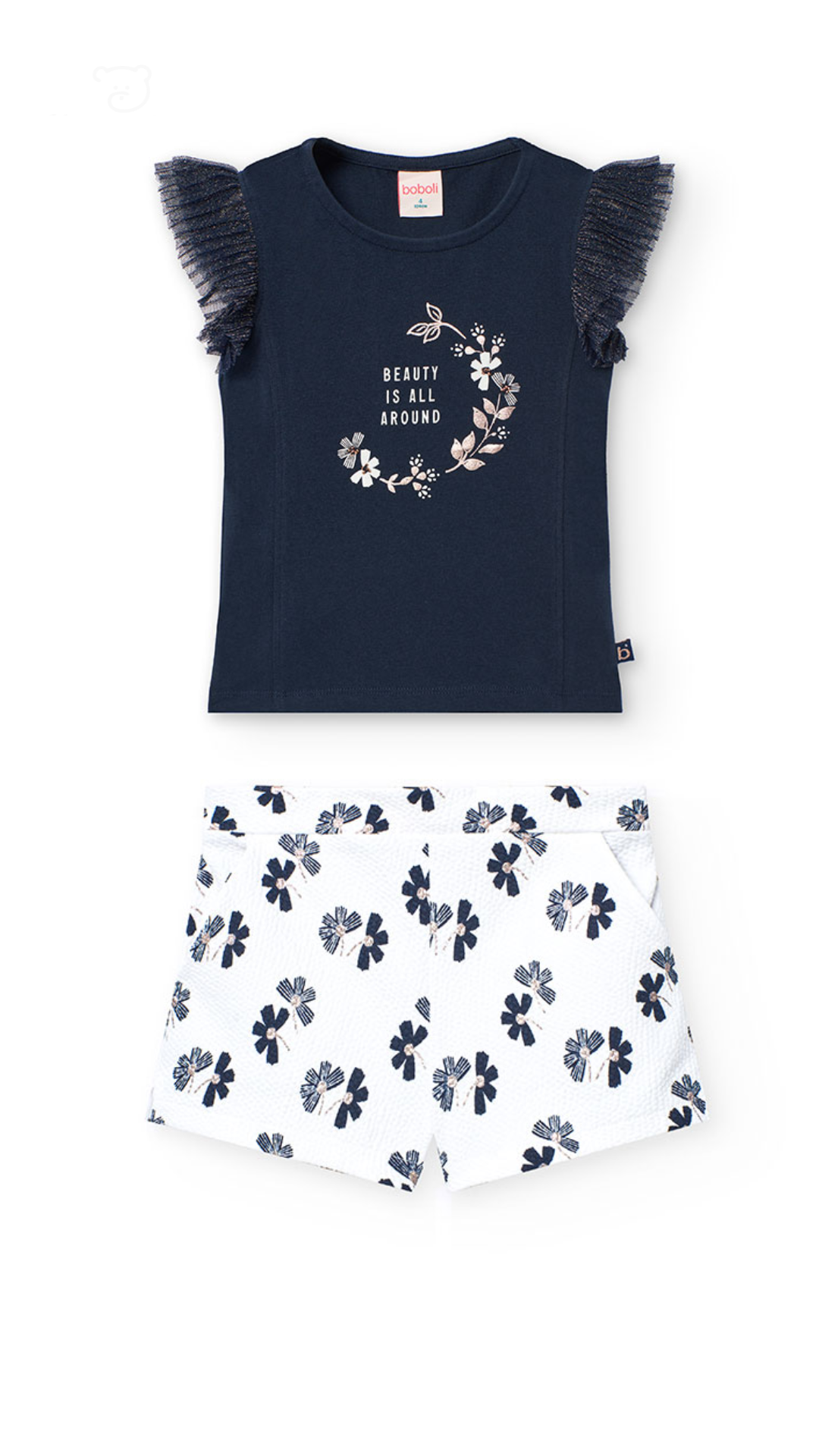 Set de shorts de estampado de flores con blusa color marino.