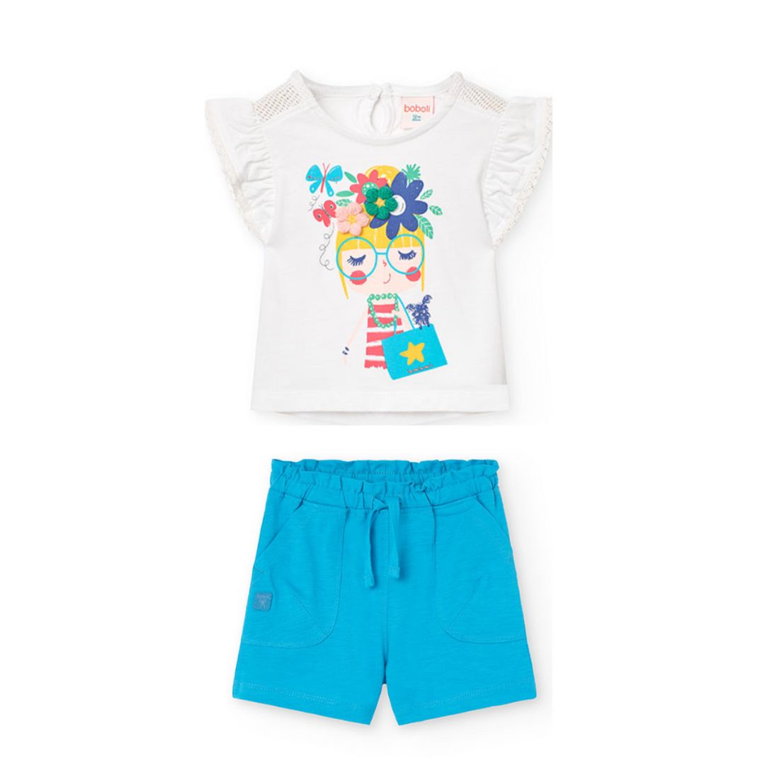 Adorable conjunto para niña que destaca por su diseño único. Playera blanca con diseño de flores tejidas y short celeste. Una pieza perfecta que combina feminidad y funcionalidad. Confeccionado con telas suaves y resistentes que permiten libertad de movimiento. Tu pequeña lucirá radiante en cualquier ocasión.