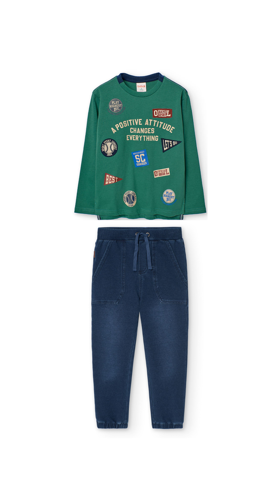 Este conjunto está lleno de carácter y detalles únicos. La camiseta de manga larga en color verde bosque se convierte en la protagonista gracias a su variedad de parches bordados con mensajes positivos y motivos de estilo “varsity”. El pantalón jogger de denim oscuro con efecto lavado proporciona un look moderno y desenfadado, además de ser increíblemente cómodo. Es el atuendo perfecto para los niños que quieren expresar su estilo y energía.