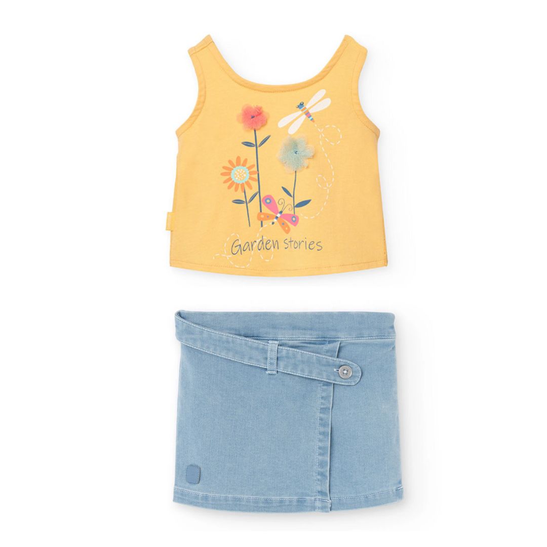 Adorable conjunto para niña que destaca por su diseño único. Blusa amarilla sin mangas con estampado y short celeste. Una pieza perfecta que combina feminidad y funcionalidad. Confeccionado con telas suaves y resistentes que permiten libertad de movimiento. Tu pequeña lucirá radiante en cualquier ocasión.